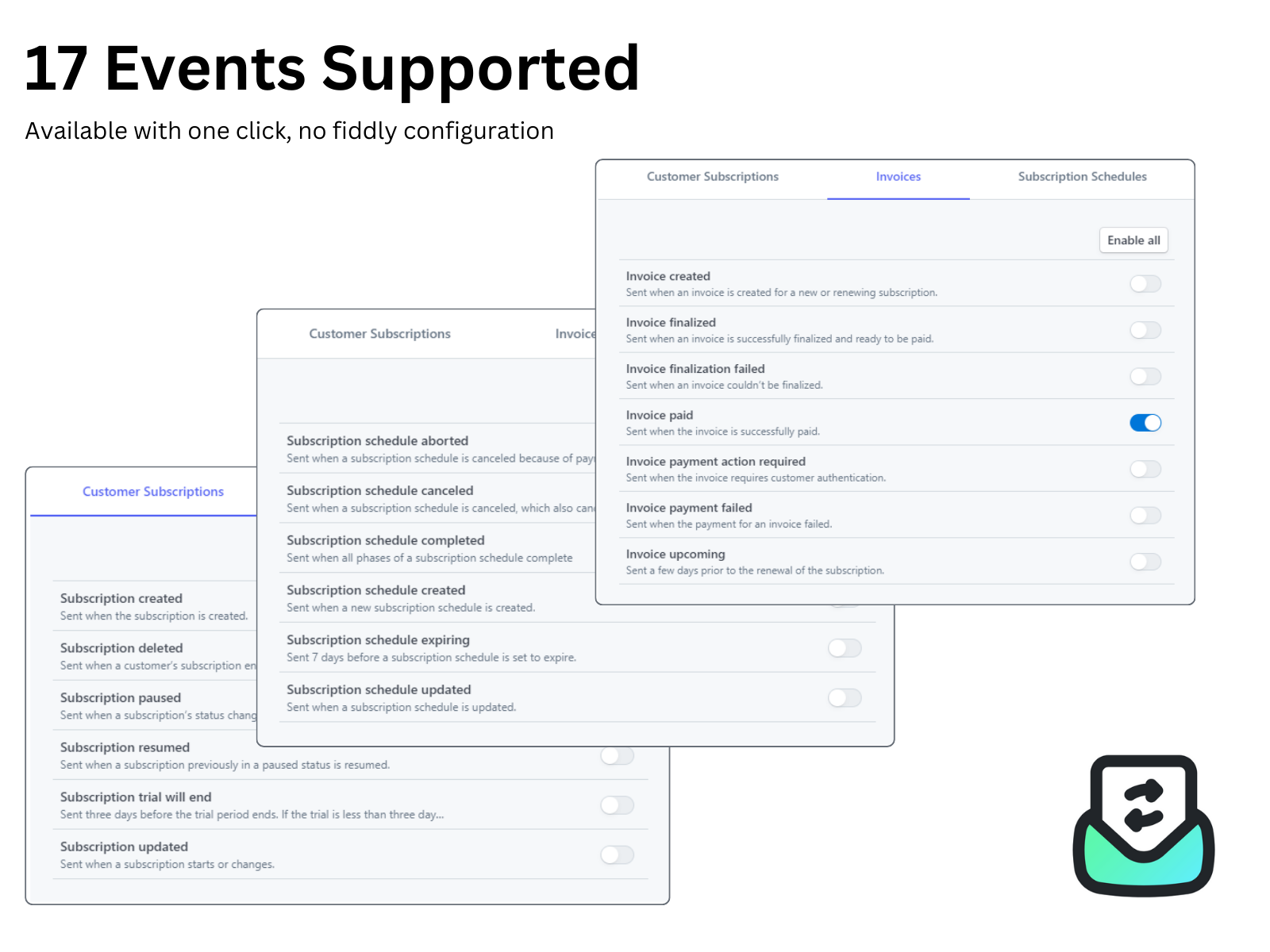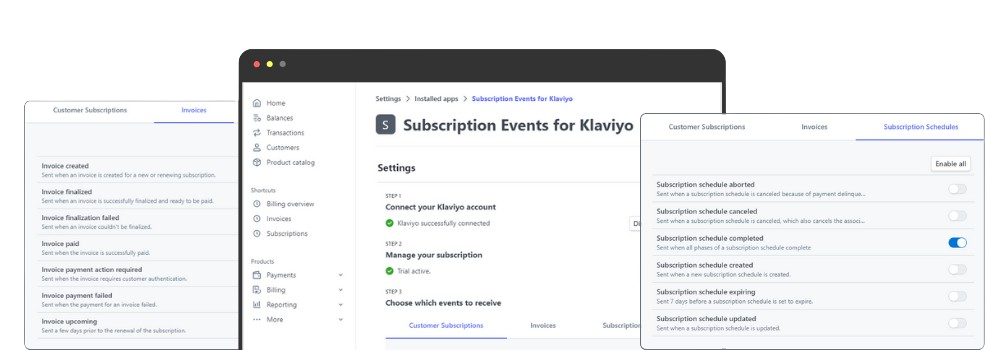 Events for Klaviyo supports Customer Subscription events, Invoice events and Subscription Schedule events.