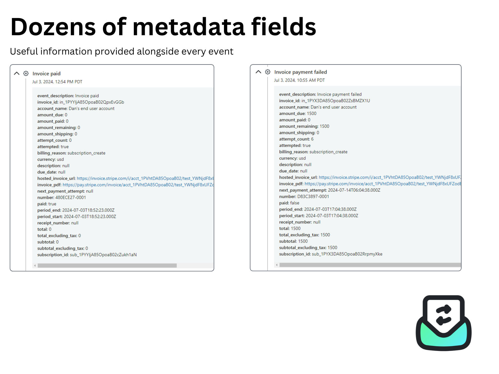 Each event is sent to Klaviyo along with useful metadata, like invoice URLs, dates, totals, subtotals, tax amounts and more.