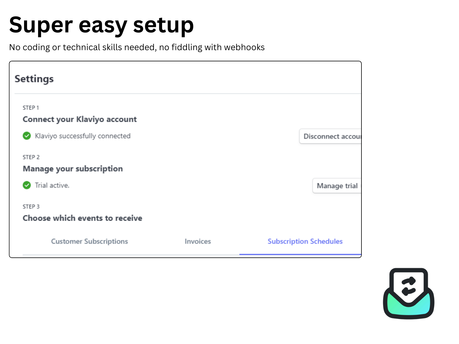 Connecting your account doesn't need you to set up webhooks, or copy and paste code or keys.